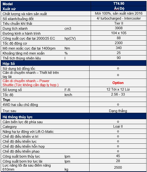 Đây là dòng máy kéo mới của New Holland. New Holland đã thiết kế dòng máy TT4 với sự kiểm soát và điều khiển dễ dàng. Mang lại những tính năng mới với sự hiệu quả tối ưu. TT4.90 được trang bị những công nghệ mới - Hộp số sử dụng Power Shuttle (Tiến lùi không đạp ly hợp) nhằm giảm tối đa thời gian chết khi hoạt động trên đồng. TT4.90 đáp ứng những yêu cầu công việc nặng nhọc nhất và ứng dụng cho: Ruộng Lúa khô, Mía, Bắp, Sắn mì...